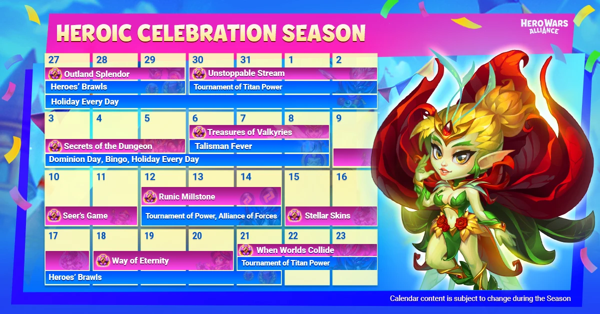 📆Here it is — the Heroic Celebration Season calendar! So many events and updates — no chance to get bored😉 And don’t forget: the Guild Clash will also take place this Season. Secret insider info: mark your calendars for the end of the Season🤫