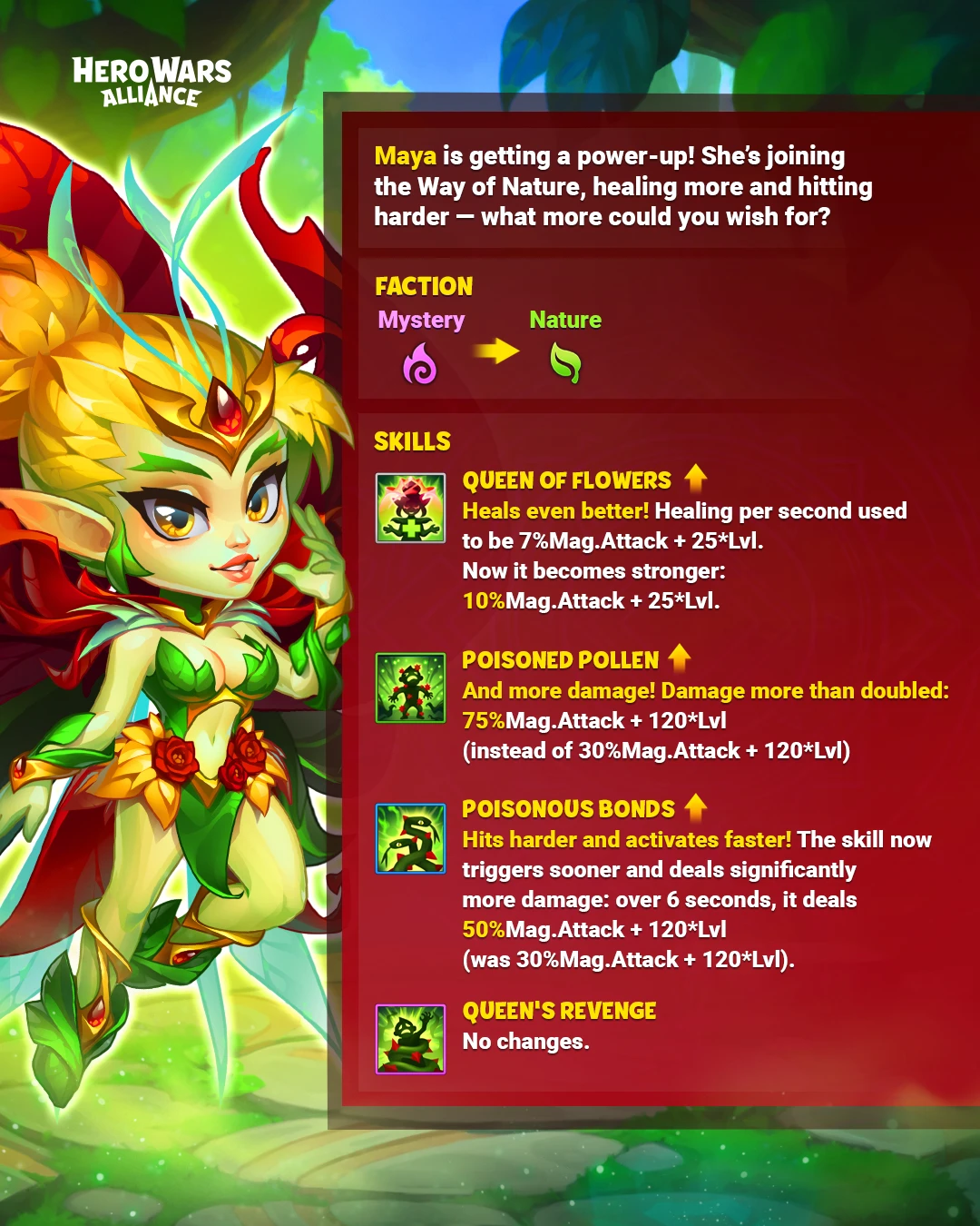 Maya’s always been amazing — and now she’s getting even better! We’re only tweaking what truly matters: boosting her healing, empowering her strikes, and making her look even more stunning🌺 Her move to the Nature Faction will also open up some exciting new synergies. Any guesses who we’re talking about?😉