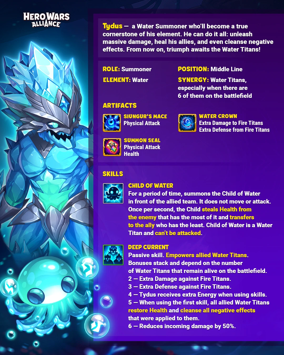 Meet Tydus — the master of waves and true team spirit🌊 He knows real power is born from unity, and with him around, allies stand firm like a mighty fortress. He’s the perfect teammate: deals massive damage, heals his squad, and is ready to bring the power of Water back to the top.